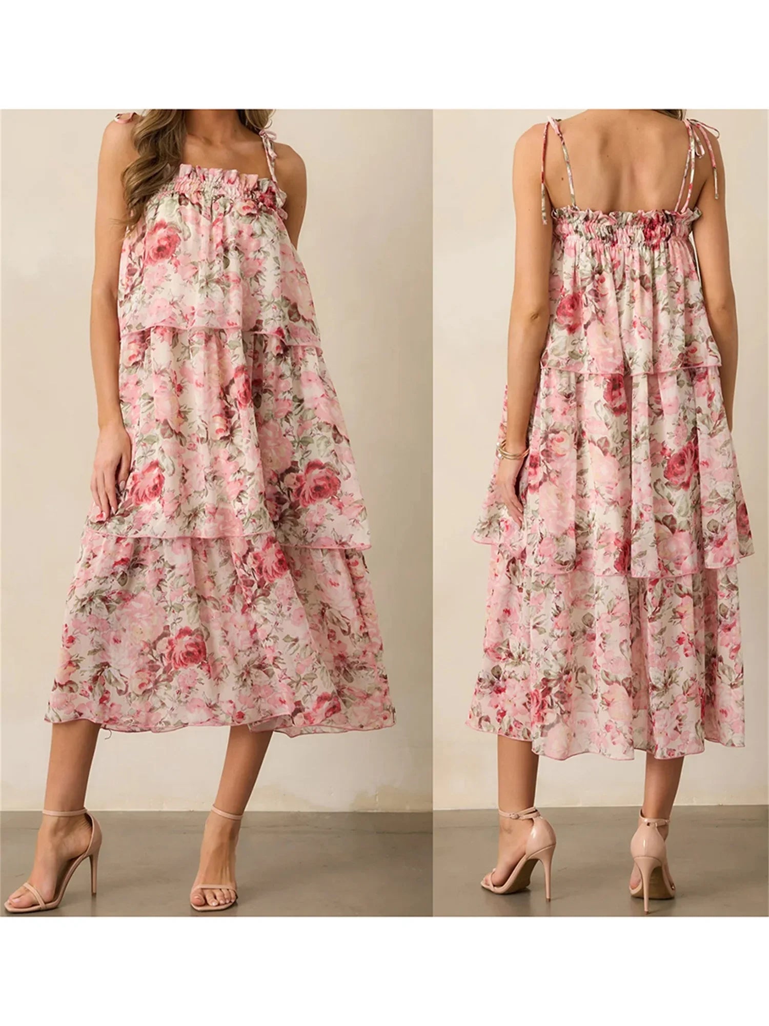 Embrace timeless charm with this women's floral sleeveless midi dress, designed to bring soft femininity to your summer wardrobe. Featuring a relaxed silhouette and tiered ruffle hem, this piece captures a breezy and elegant aesthetic perfect for warm days. The delicate shoulder straps and layered floral print design add a graceful, eye-catching touch ideal for holidays, brunches, or garden parties.