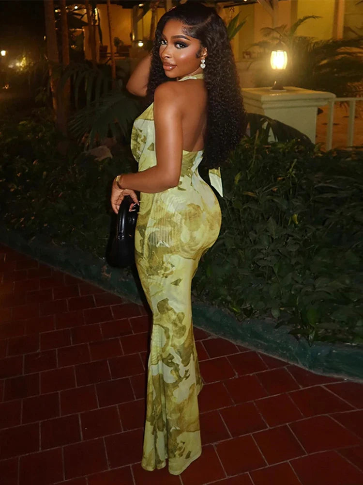 Women's Halter Maxi Dress with Artistic Print and Draped Neckline